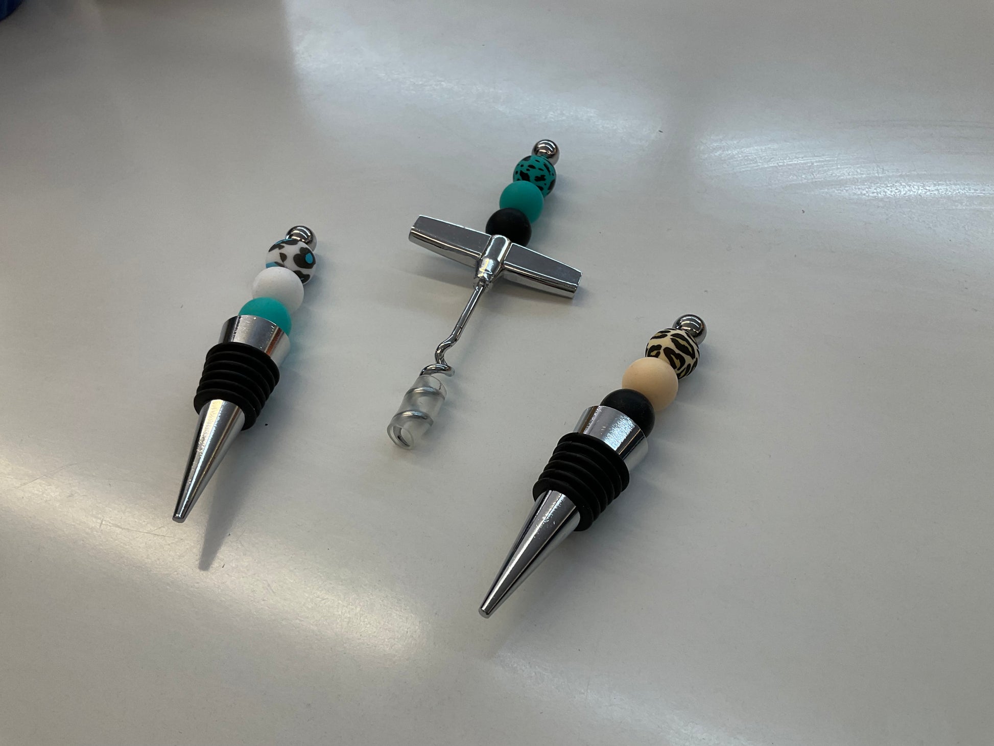 Patterned beads on metal wine stoppers or corkscrews