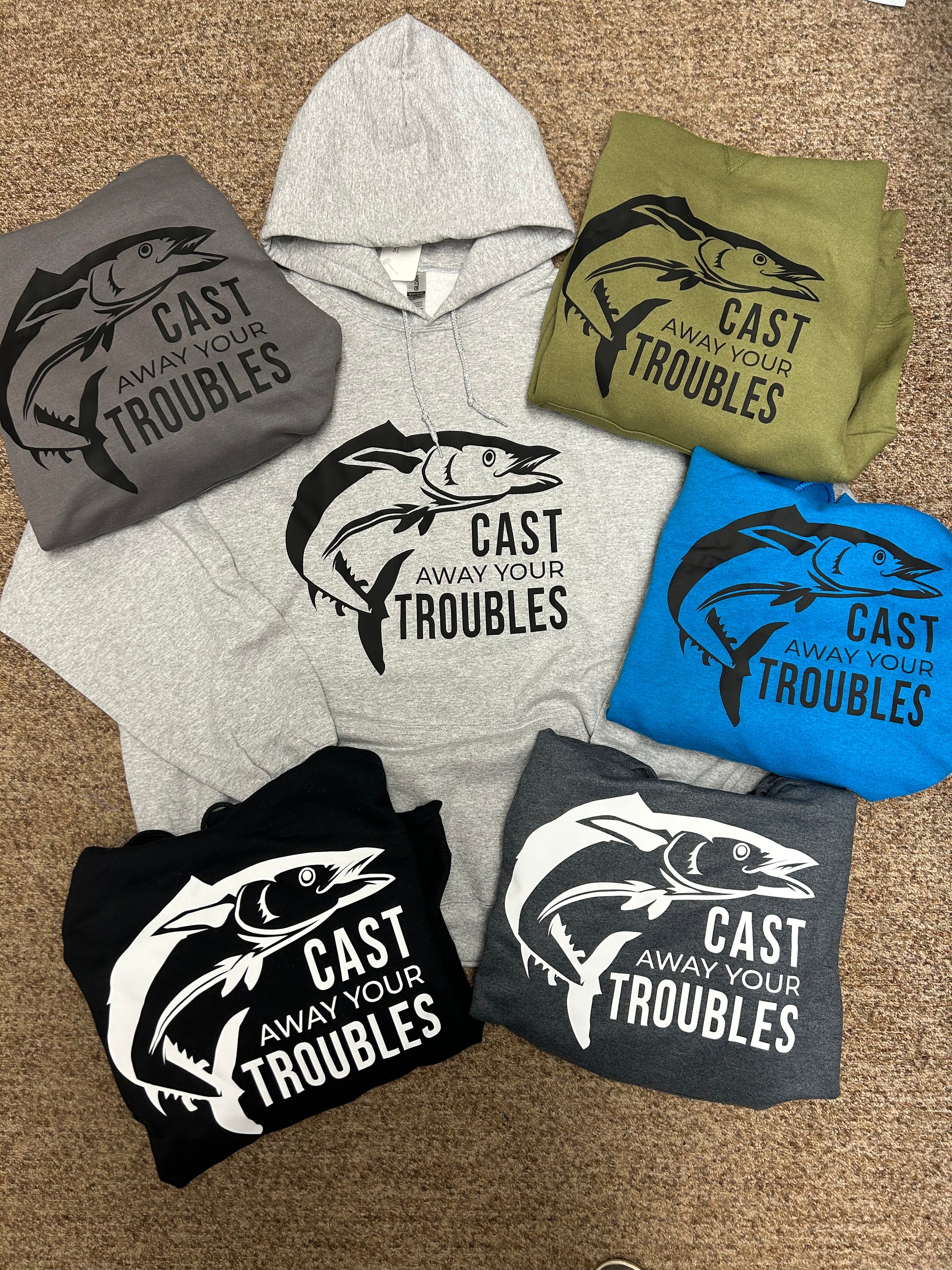Fun fishing design on tshirts and hoodies.